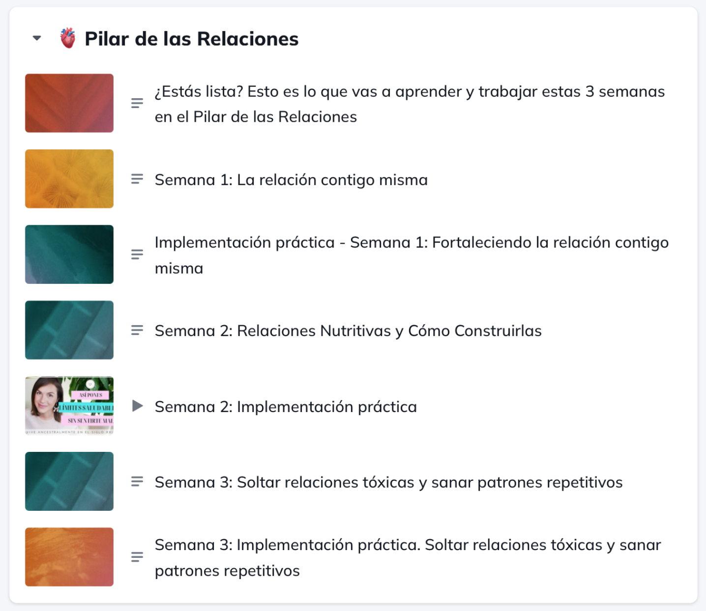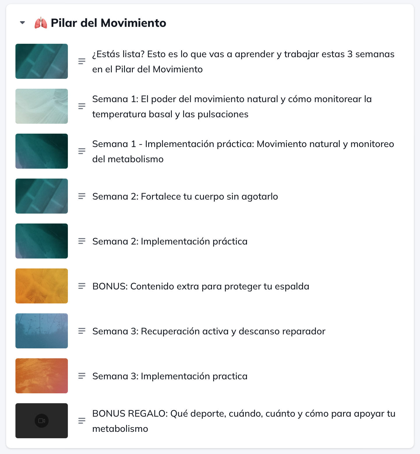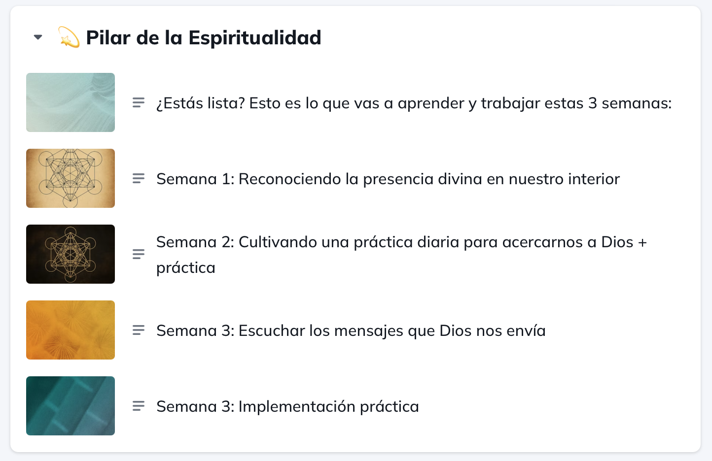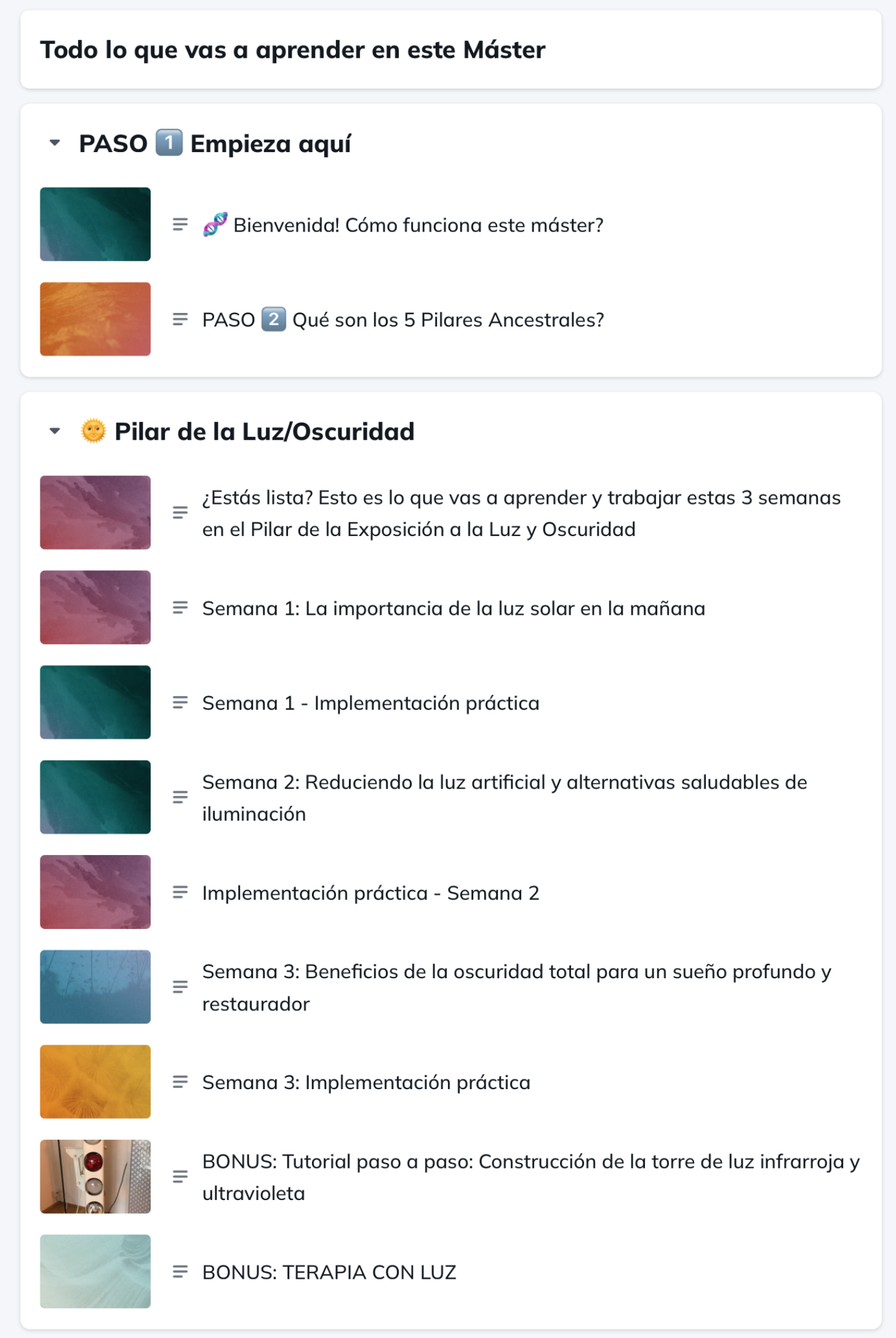Este máster está creado precisamente para que puedas integrar todos estos pilares en tu vida sin sentirte abrumada. Cada pilar se desbloquea en bloques de tres semanas: primero, aprenderás con profundidad qué significa vivir ese pilar, y luego, cada semana, aplicarás prácticas simples y poderosas para incorporarlo de forma natural en tu día a día. Sin presión. Sin perfección. Paso a paso.